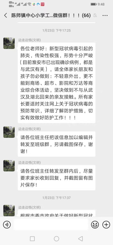 ——涟水县陈师街道科协副主席、陈师中心小学校长张元:自新型冠状病毒感染的肺炎疫情阻击战打响以来,为了预防和控制疫情在学校发生、发展,提高广大师生的自我保护意识,保障全体师生的身体健康与生命安全,维护学校正常的教学秩序,张校长第一时间成立校肺炎防控工作领导小组,制定应急预案并落实各项措施,积极组织教职工学习防控专业知识,下发《告家长书》,并通过微信群、QQ群、短信等,帮助师生及家长提高防范意识、了解防治知识。