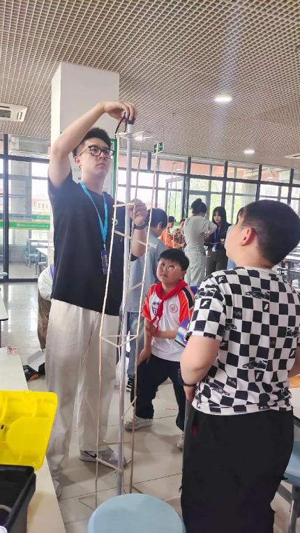 在创意与智慧碰撞的激烈比拼中,《滑道有玄机》与《挑战最高峰》两大动手实践项目精彩纷呈。前者要求参赛队伍利用有限材料,匠心独运设计滑道模型,旨在让小球在蜿蜒轨道上尽享悠长旅程,时间越久越显匠心;后者则是一场对结构稳定性与高度的极限挑战,选手们需构建木质构架,确保砝码能安然置于云端之巅,距离地面越远,成就越高。尽管材料朴素,却极大激发了各团队的策略规划、精密计算、灵巧动手与无缝协作潜能。凭借日常积累的知识与实战经验,各队分工明确,创意无限,诸多作品惊艳亮相。尤为值得一提的是,淮安市新区实验小学1队在《挑战最高峰》项目中,三名小将默契配合,以非凡创意与精湛技艺,将砝码稳稳托举至超过3米的高度,赢得了现场师生的阵阵惊叹与由衷赞赏,展现了团队协作的力量与青少年科技创新的无限可能。