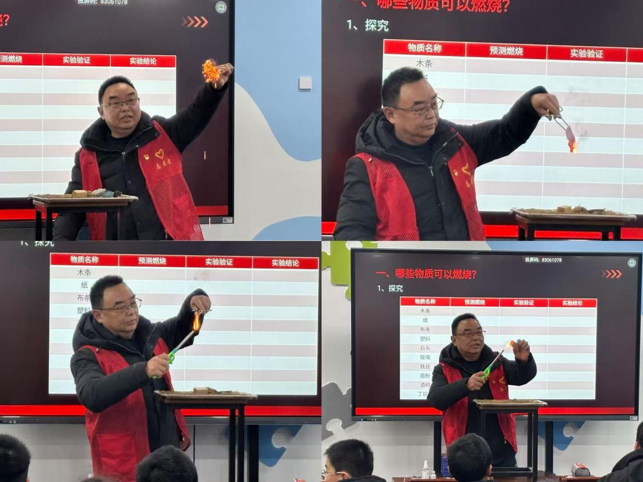随后,冀老师结合生动的视频案例与直观投屏演示,深入浅出地解析燃烧原理:“燃烧是可燃物与空气中的氧气发生的剧烈化学反应,过程中会释放光和热,而可燃物、助燃物、燃点这三个条件必须同时具备,缺一不可。”结合常见物质燃点数据表,大家惊讶地发现纸张燃点竟低于木材,氢气虽燃点高却易与空气混合引发爆炸,科学知识在生动讲解中深入人心。