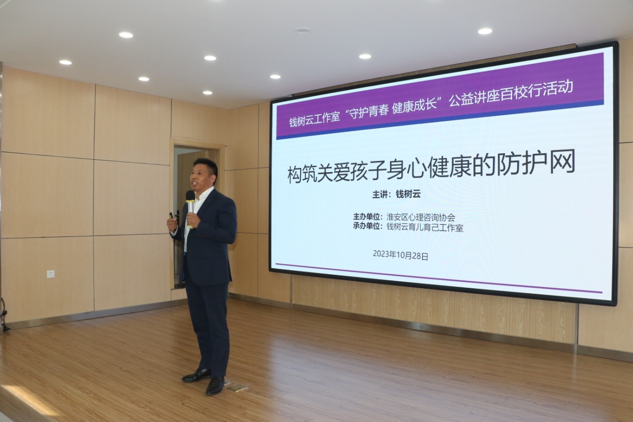选举大会结束后,青年励志演讲家、家庭(亲子)教育专家钱树云在作了《构筑关爱孩子身心健康的防护网》专题讲座。他以案说理,声情并茂,运用发生在当今青少年群体中大量生动真实、触目惊心的典型案例从专业角度剖析其背后的深层次原因。以浅显易懂而不失幽默的表达,以丰富灵动而充满激情的姿体语言,引发与会者对青少年心理的关注与思考,激发起人们高度重视并科学呵护孩子心理健康的成人担当。整个讲座入情入理,深入浅出,言之凿凿,情之切切,高潮迭起,精彩不断。