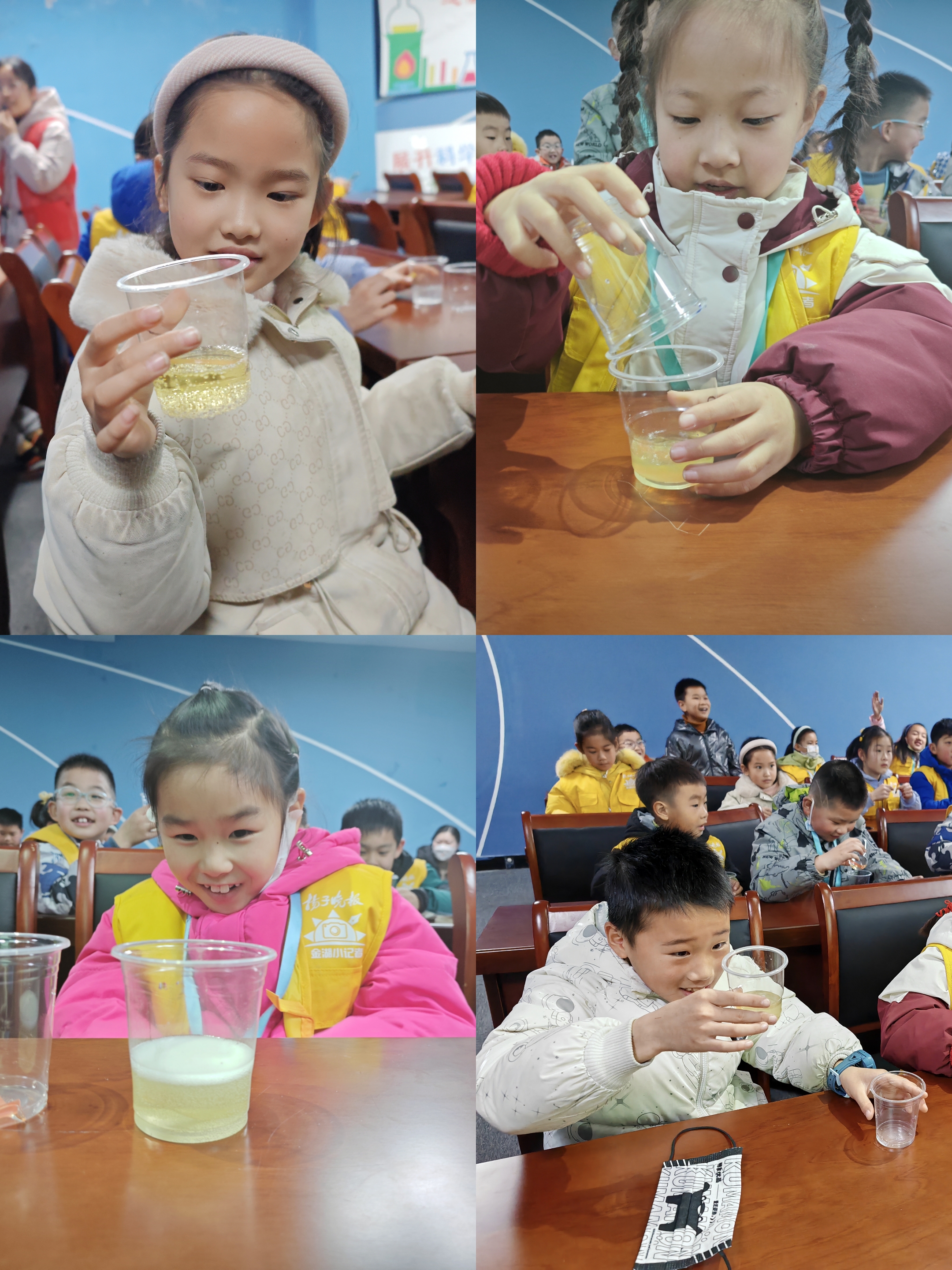 活动开始,科技辅导员拿出四杯相似的透明溶液,分别是纯净水、白醋、碱水、雪碧,询问小朋友们鉴别的方法,面对四杯几乎一模一样的液体,大家提出了尝、闻、观察细微差别等方法。这时,科技辅导员拿出一瓶紫色的黑枸杞茶,分为四杯,请四位小朋友上前,分别将四杯透明溶液倒进黑枸杞茶中,一起观察变化。大家发现其中一杯明显变蓝绿色、一杯明显变红、一杯微微发红、一杯颜色无明显变化。科技辅导员拿出pH试纸,分别测试四杯透明溶液,试纸也变成不同颜色,对照pH值色别表,科技辅导员介绍,使黑枸杞茶和试纸变蓝碱水呈碱性,使黑枸杞茶和试纸变红的白醋和雪碧呈酸性,雪碧酸性弱于白醋,而没有颜色变化的纯净水则呈中性。小朋友们对神奇的溶液颜色变化惊叹不已。