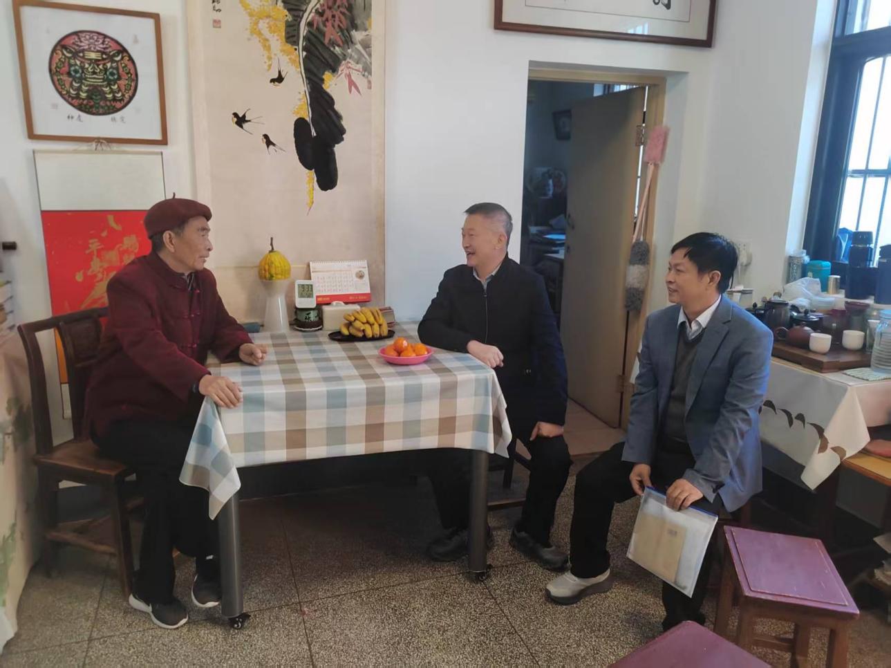 随后,郜明会长登门慰问了社科分会会员陆功勋,详细询问他的生活和身体状况。作为老科协工作的“热心人”,陆功勋积极投身社会公益事业,多次深入学校、社区宣传非遗文化,普及法律知识,彰显了老科技工作者的无私奉献精神。