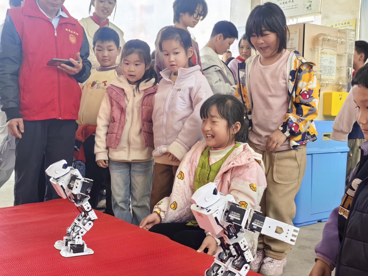 机器人表演现场,灵活灵动的机器人闪亮登场,将现场氛围推向高潮。它伴随着欢快的音乐,精准完成挥手、转身、俯卧撑、舞蹈等憨态可掬的动作,还与同学们亲切互动。孩子们兴奋地围在舞台四周,拍手欢呼,感受现代科技的乐趣。